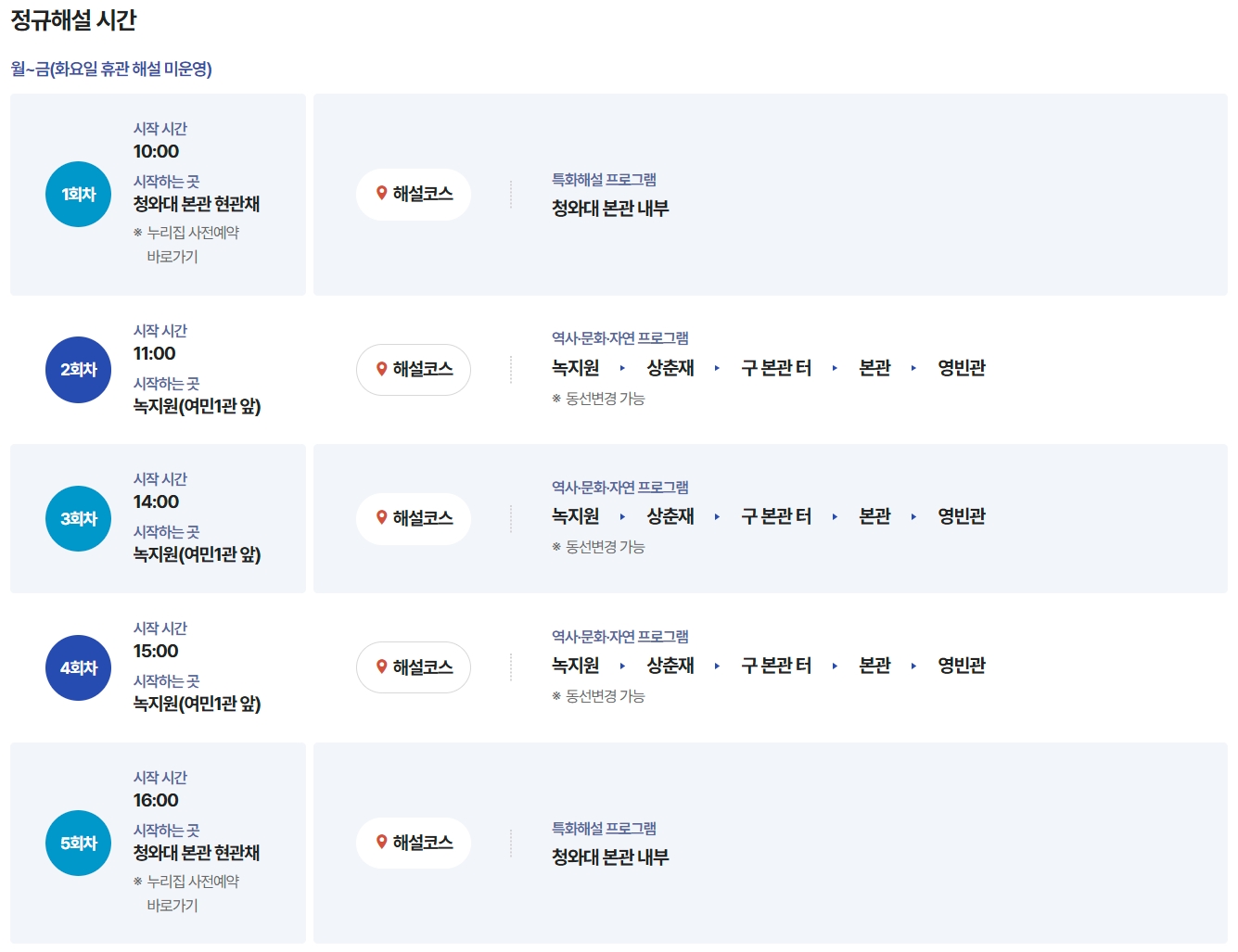 | 정규 해설 코스 | 본관, 영빈관, 춘추관 | 전문 해설사의 설명 제공 |